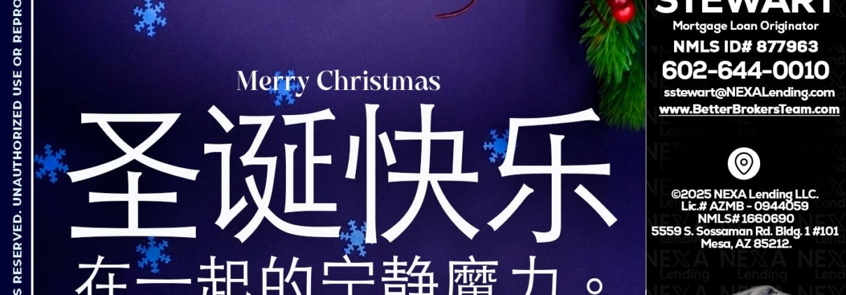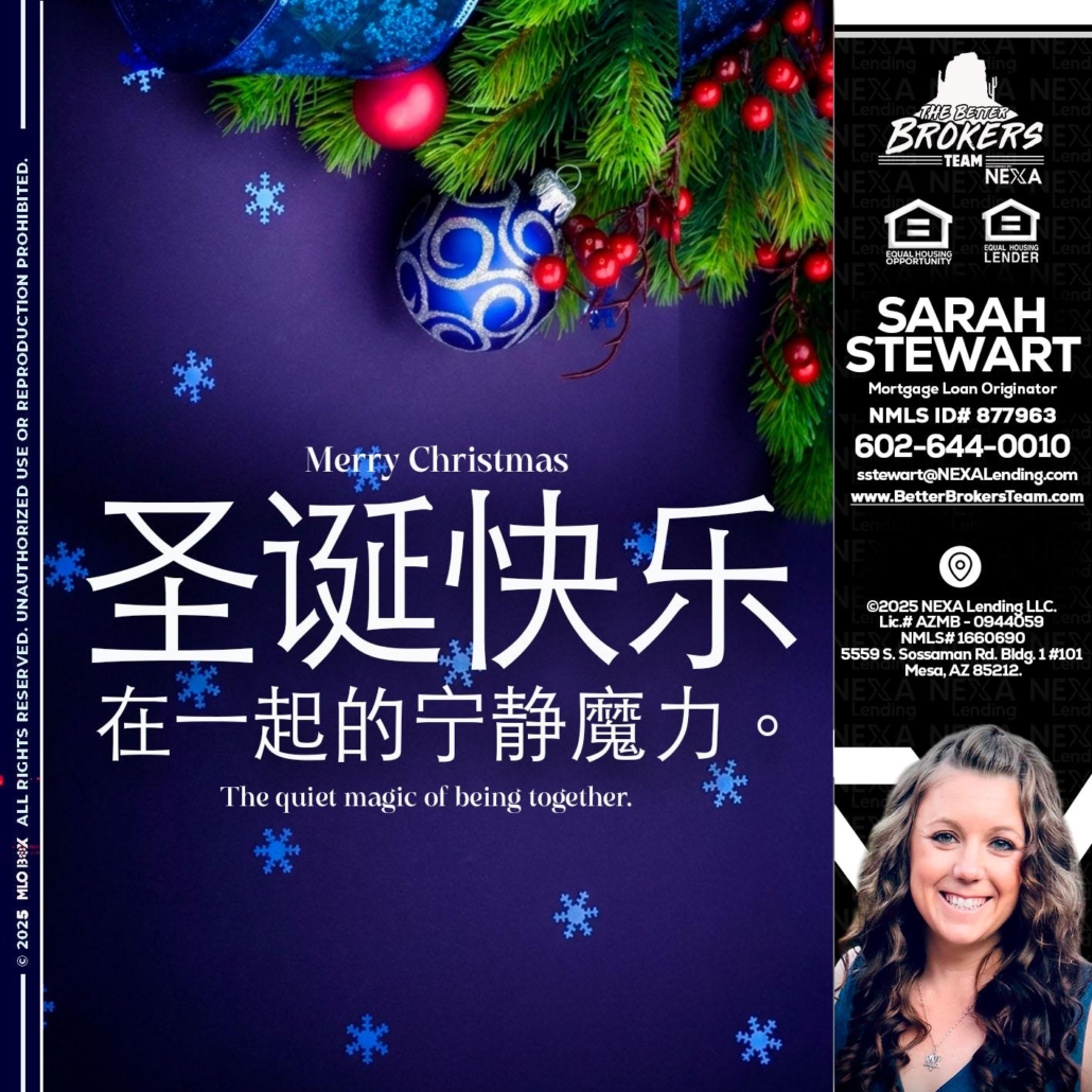 圣诞快乐 在一起的宁静魔力。 - Sarah Stewart -Mortgage Loan OriginatorHi, my name is Sarah Stewart. I’m a Loan Officer with NEXA Lending LLC., offering personalized mortgage solutions, fast customized quotes, great rates and service with integrity.