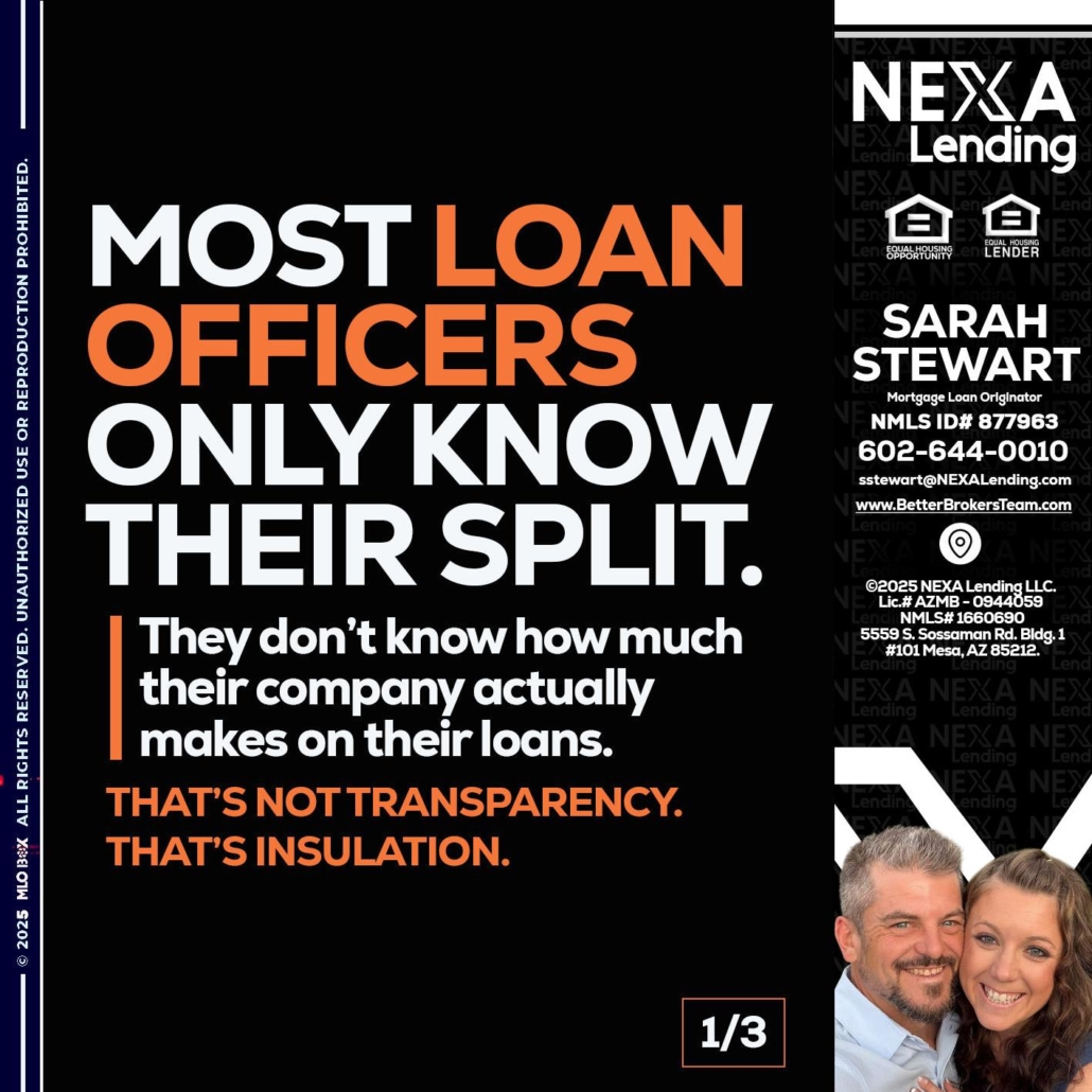 1 OF 3 - Sarah Stewart -Mortgage Loan OriginatorHi, my name is Sarah Stewart. I’m a Loan Officer with NEXA Lending LLC., offering personalized mortgage solutions, fast customized quotes, great rates and service with integrity.