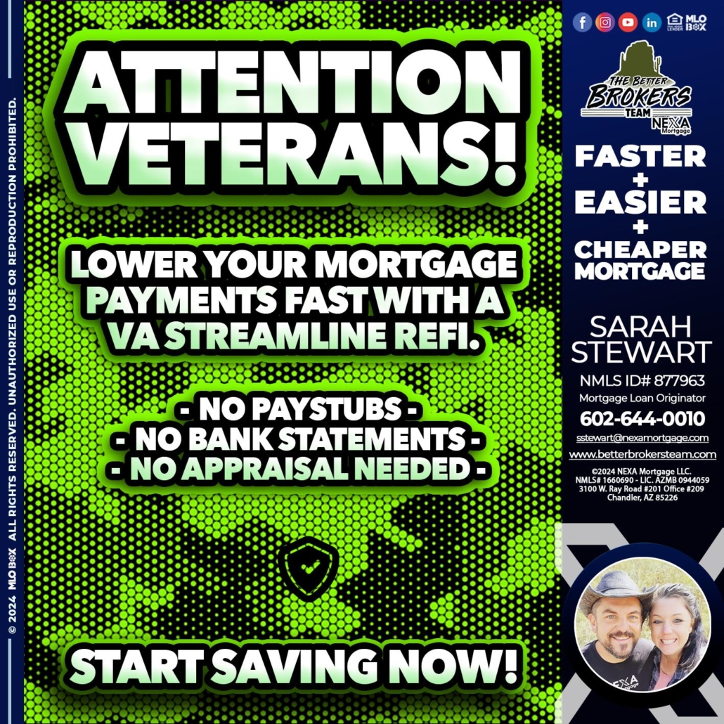 ATTENTION VETERANS - Sarah Stewart -Mortgage Loan OriginatorHi, my name is Sarah Stewart. I’m a Loan Officer with NEXA Mortgage LLC., offering personalized mortgage solutions, fast customized quotes, great rates and service with integrity.
