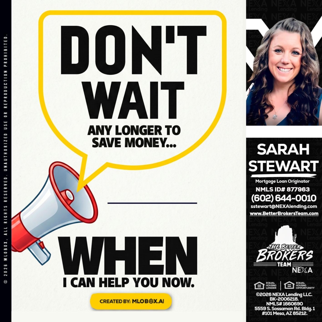 DONT WAIT - Sarah Stewart -Mortgage Loan OriginatorHi, my name is Sarah Stewart. I’m a Loan Officer with NEXA Lending LLC, offering personalized mortgage solutions, fast customized quotes, great rates and service with integrity.